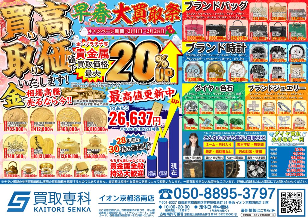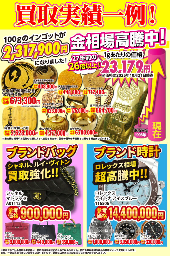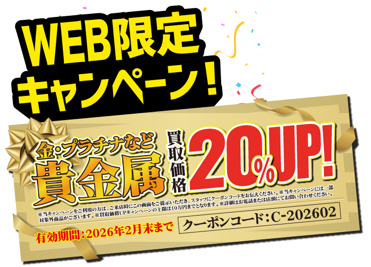 キャンペーン実施店舗 よくあるご質問 買取価格は主にどんな要素から決まるのでしょうか? お品物の状態や付属品の有無、最新相場、流通量などによって買取価格を算出します。 どんなものを買い取ってもらえますか? 金・貴金属・ブランド品はもちろん、お値段がつくか迷われているものも是非お持ちください。 傷や汚れのあるアイテムでも買取可能ですか? 大歓迎です。未使用品などのお持ち込みは少なく、傷や汚れのあるアイテムをお持ちいただく方が半数以上です。状態の悪いお品物やカビなどがあってもお買取可能なケースもございます。 どんな情報があればすぐに査定額を教えてもらえますか? お品物の名前や種類、状態、またはブランド名、型番などの情報があると、概ねの査定額をお伝えできるかと思います。 店舗での査定時間はどのくらいですか? お品物の種類や個数にもよりますが、約5分から30分ほどの査定時間となるケースが多いです。事前にある程度の査定時間をお伝えいたしますので、ご安心ください。